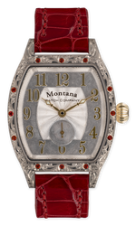 Argentium sterling silver display back tonneau case with Western Bright Cut hand engraving and 12 Mozambique Garnets, 14k yellow gold winding crown. Silver guilloché dial with gold Cathedral style hands protected by scratch-resistant sapphire crystal. Red crocodile ostrich strap finished with matching engraved silver buckle.