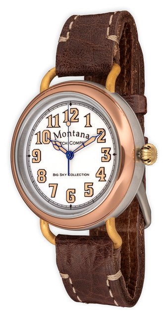 Stainless steel case and 14KGP wire trench style lugs, copper bezel with high polish finish, 14KGP yellow gold winding crown. White lacquer dial with blue Sport style hands protected by scratch-resistant sapphire crystal. Brown bison leather strap finished with matching stainless buckle.