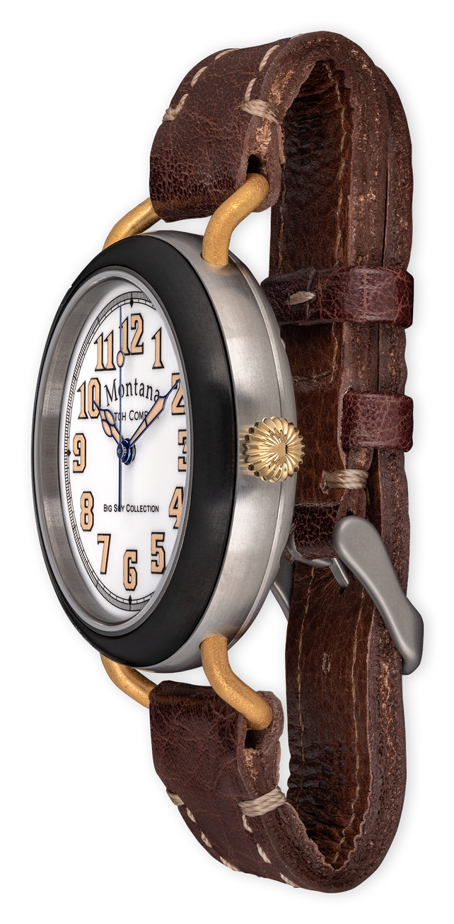 Stainless steel case and 14KGP wire trench style lugs, DLC stainless steel bezel with satin finish, 14KGP yellow gold winding crown. White lacquer dial with blue Sport style hands protected by scratch-resistant sapphire crystal. Brown bison leather strap finished with matching stainless buckle.