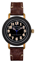 DLC stainless steel case and 14KGP wire trench style lugs, DLC stainless steel bezel with vintage American scroll engraving, 14KGP yellow gold winding crown. Black lacquer dial with blue Sport style hands protected by scratch-resistant sapphire crystal. Brown bison leather strap finished with matching stainless buckle.