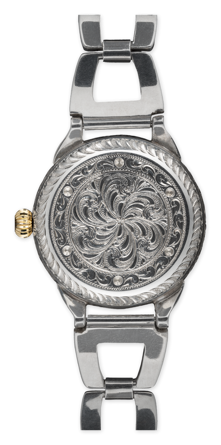 Argentium sterling silver case with Western Bright Cut hand engraving and single row of diamond pave with Queen Anne Style lugs, 14k yellow gold winding crown. White mother-of-pearl dial with gold Cathedral style hands protected by scratch-resistant sapphire crystal. Finished with custom Argentium sterling silver bracelet with Western Bright Cut hand engraving.