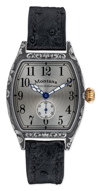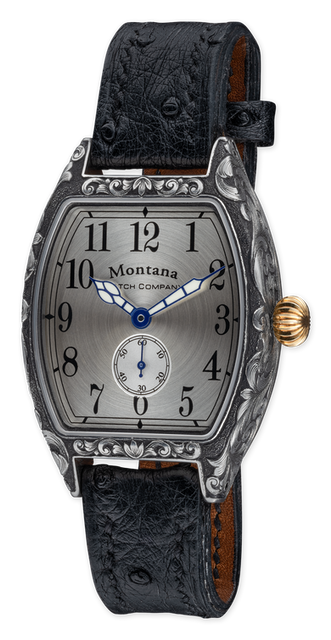 Stainless steel display back tonneau case with English Scroll hand sculpted engraving, 14k yellow gold winding crown. Sterling silver dial with blue Sport style hands protected by scratch-resistant sapphire crystal. Custom black ostrich strap finished with matching engraved stainless buckle.