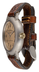 Argentium sterling silver case with coined edge, 18k yellow gold winding crown. 14k yellow dial with gold Spade and Stick style hands protected by scratch resistant sapphire crystal. Custom brown hand-tooled strap finished with matching silver buckle.