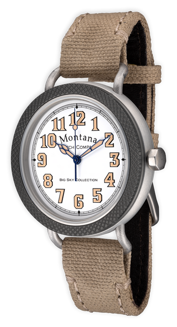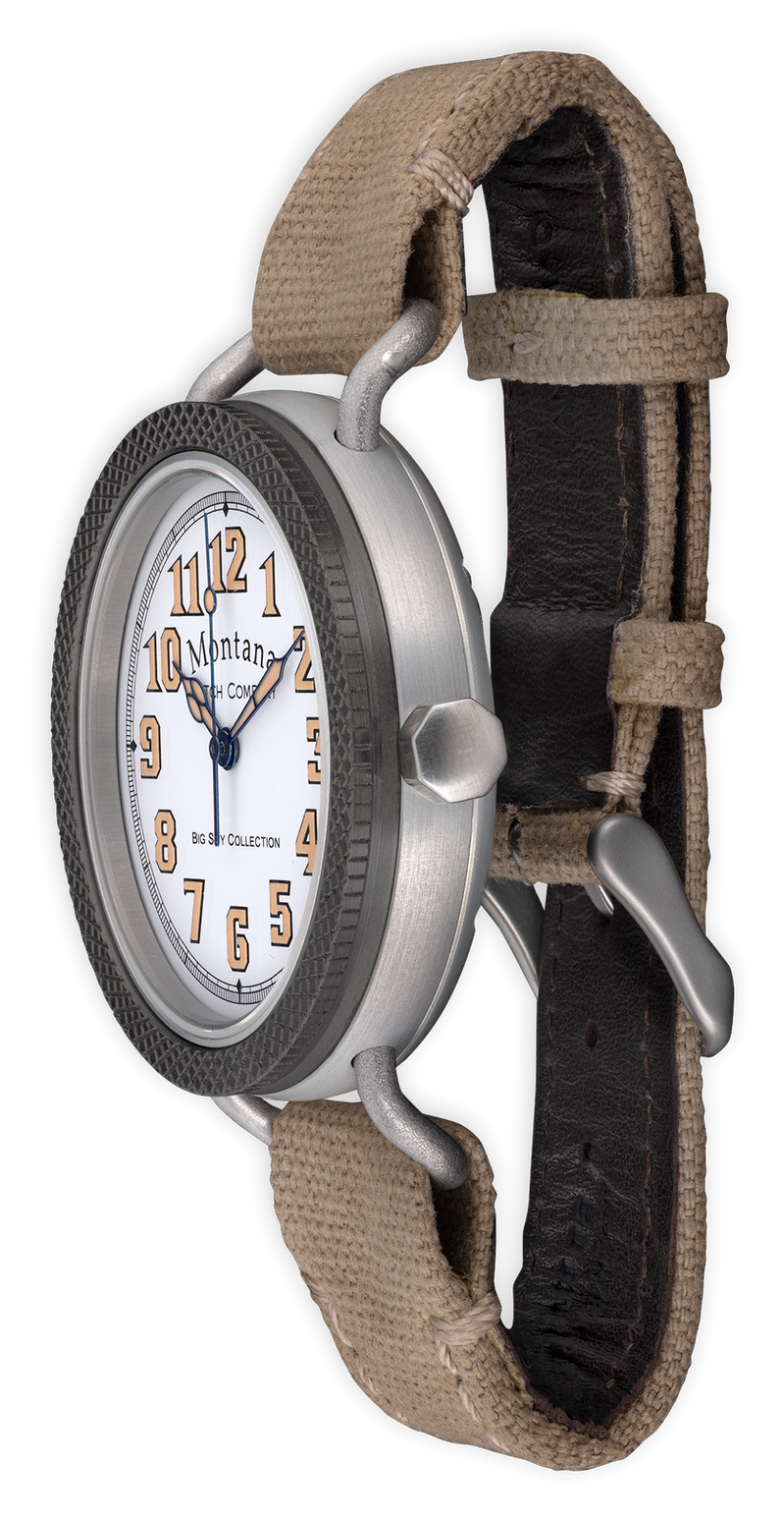 Anodized aircraft aluminum case with gray knurled bezel, stainless steel threaded crown. White lacquer dial with blue Sport style hands protected by scratch-resistant sapphire crystal. Cream canvas strap finished with stainless buckle.
