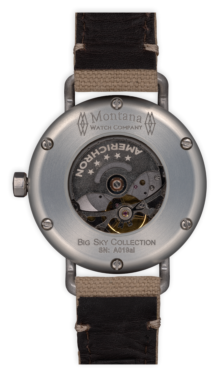 Anodized aircraft aluminum case with gray knurled bezel, stainless steel threaded crown. White lacquer dial with blue Sport style hands protected by scratch-resistant sapphire crystal. Cream canvas strap finished with stainless buckle. 44mm | Americhron 7AC0, self-winding | Individually regulated