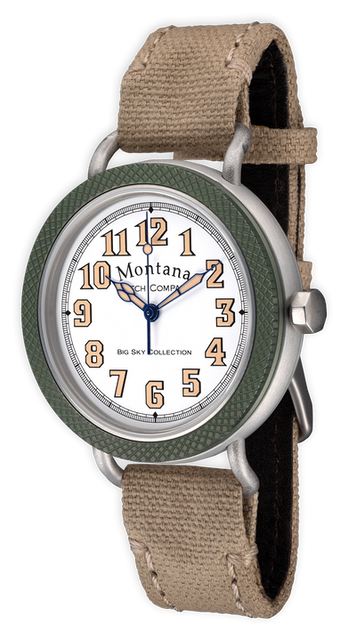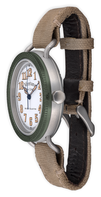 Anodized aircraft aluminum case with green knurled bezel, stainless steel threaded crown. White lacquer dial with blue Sport style hands protected by scratch-resistant sapphire crystal. Cream canvas strap finished with stainless buckle. 44mm | Americhron 7AC0, self-winding | Individually regulated